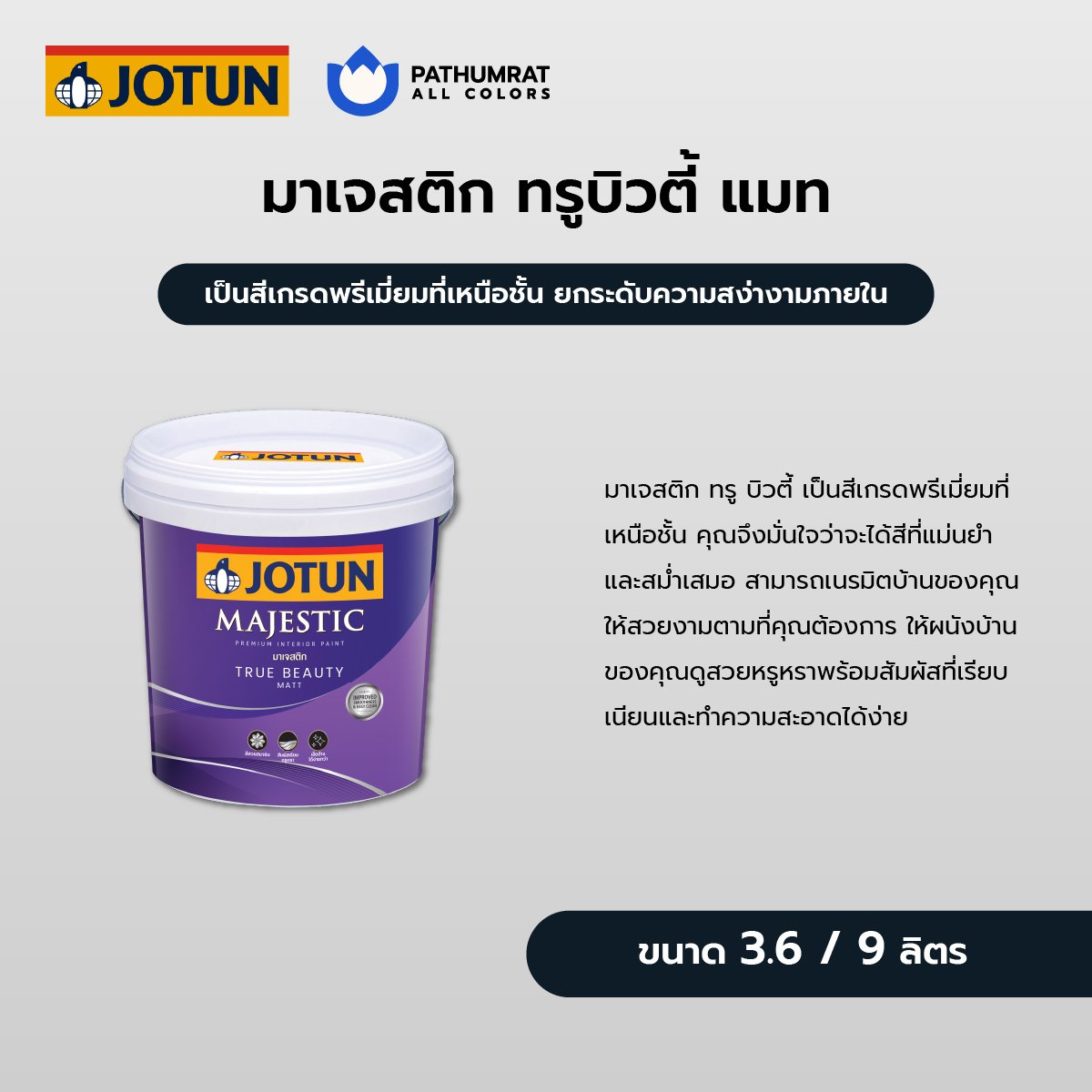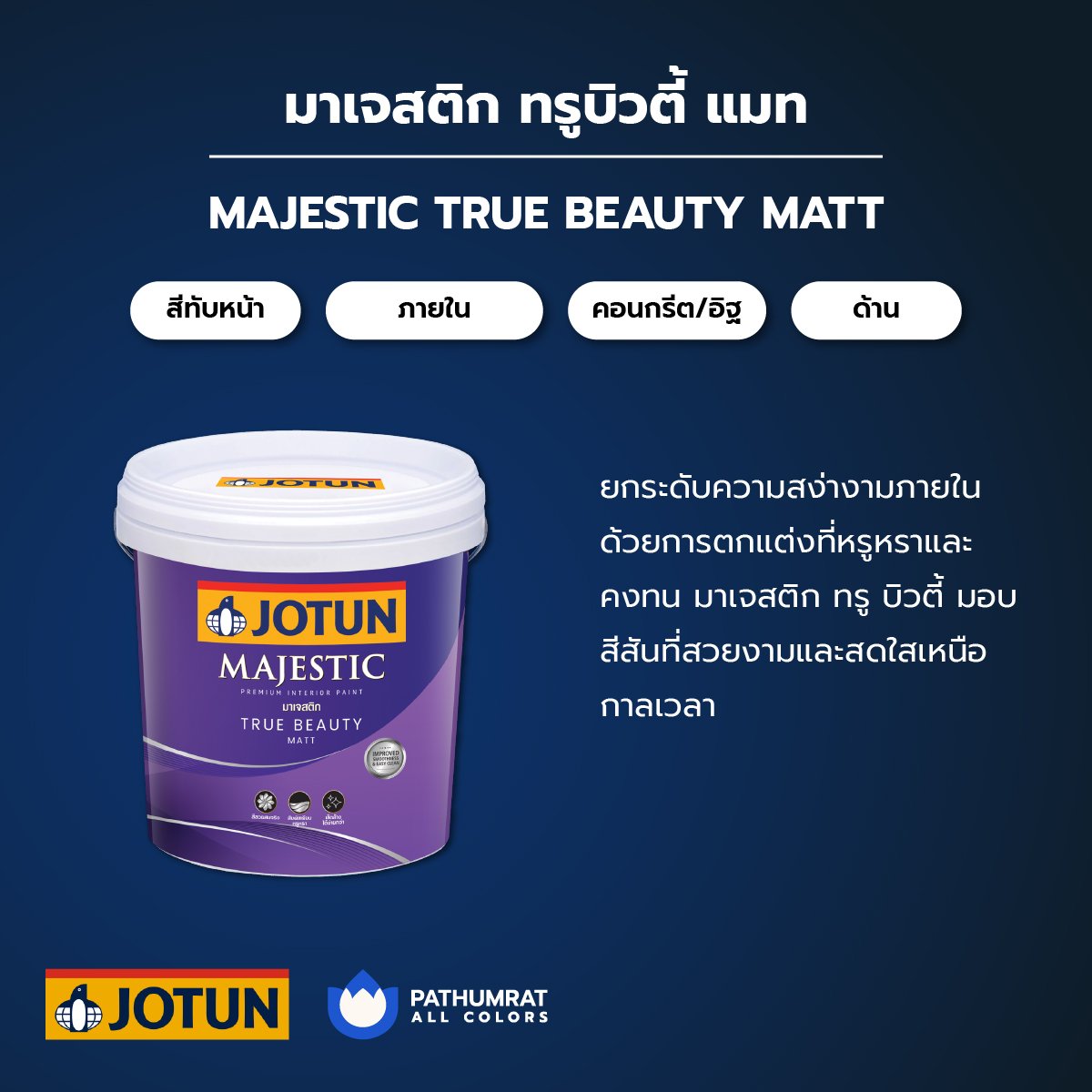 Jotun Majestic True Beauty Matt is a high-quality water-based interior paint with a matt finish. It is designed to provide a smooth and durable finish on a variety of interior surfaces, including walls and ceilings.