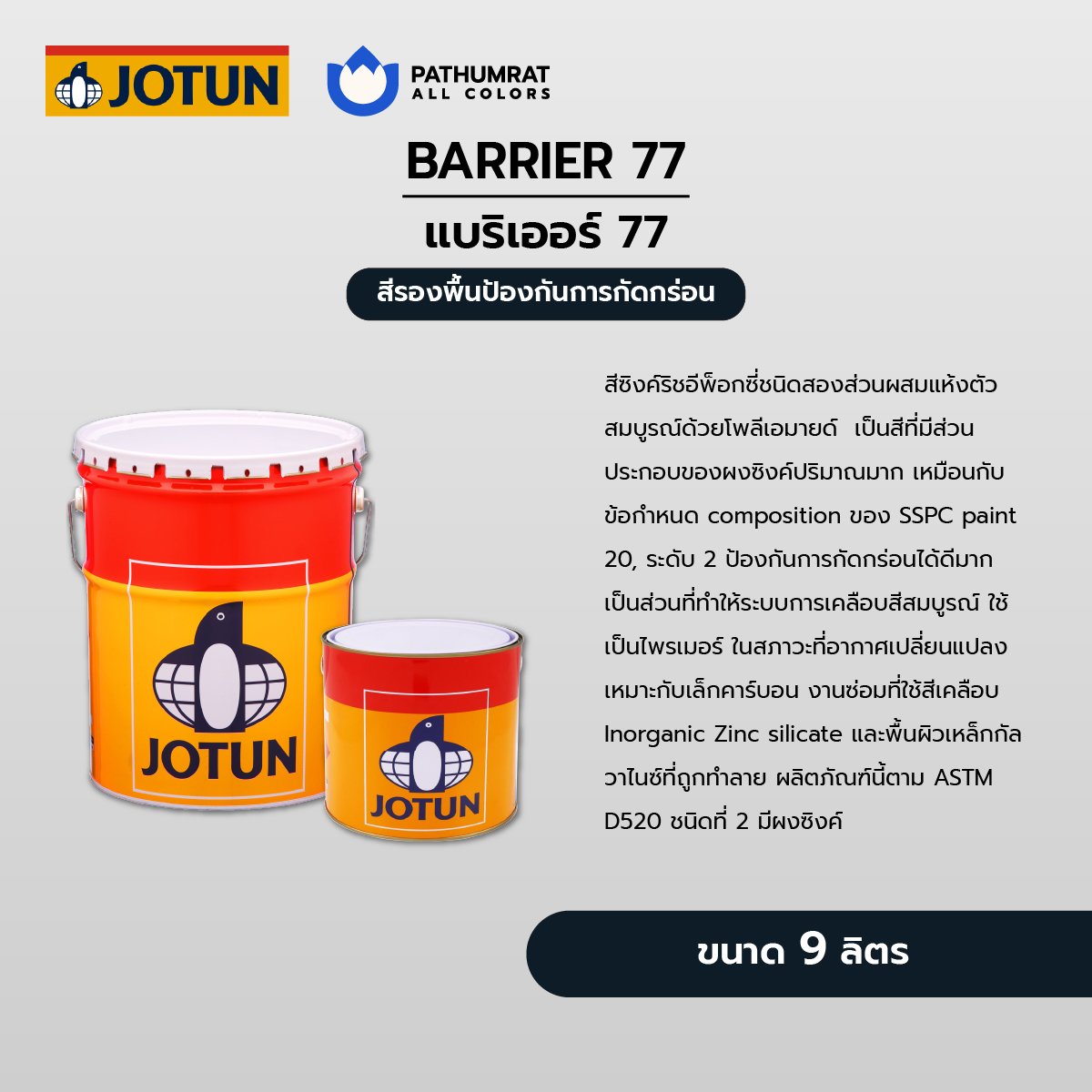สีโจตัน สีแบริเออร์77 เป็นสีซิงค์ริชอีพ็อกซี่ชนิด สองส่วนผสมแห้งตัวสมบูรณ์ ด้วยโพลีเอมายด์ เป็นสีทีมีส่วนประกอบของผงซิงค์ปริมาณมาก เหมือนกับ ข้อกำหนด Composition ของ SSPC paint 20 ระดับ 2ป้องกันการกัดกร่อนได้ดีมาก เป็นส่วนที่ทำให้ระบบการเคลือบสีสมบูรณ์ ใช้เป็นไพรเมอร์ ในสภาวะที่อากาศเปลี่ยนแปลง เหมาะกับเล็กคาร์บอน งานซ่อมที่ใช้สีเคลือบ INORGANIC ZINC SILICATE และพื้นผวเหล็กกัลวาไนซ์ที่ถูกทำละลาย ผลิตภัณฑ์นี้ตาม ASTMD520 ชนิดที่ 2 มีผงซิงค์ สีรองพื้นซิงค์จากโจตัน รุ่น โจตัน แบริเออร์ 77 (Jotun BARRIER 77) เหมาะสำหรับเหล็กที่ยิงทรายจนขาวแล้ว กันสนิมดีเยี่ยม ทาทับตามด้วยรองพื้นอีพ๊อกซี่และสีชั้นอื่นๆตามที่ต้องการ เหมาะกับงานเรือ พ่นทราย เป็นชั้นแรก ในการพ่นสีเรือเพื่อปกป้อง ปกติความหนาประมาณ 50 ไมครอน ขนาดบรรจุ แกลลอน A B 4 ลิตร