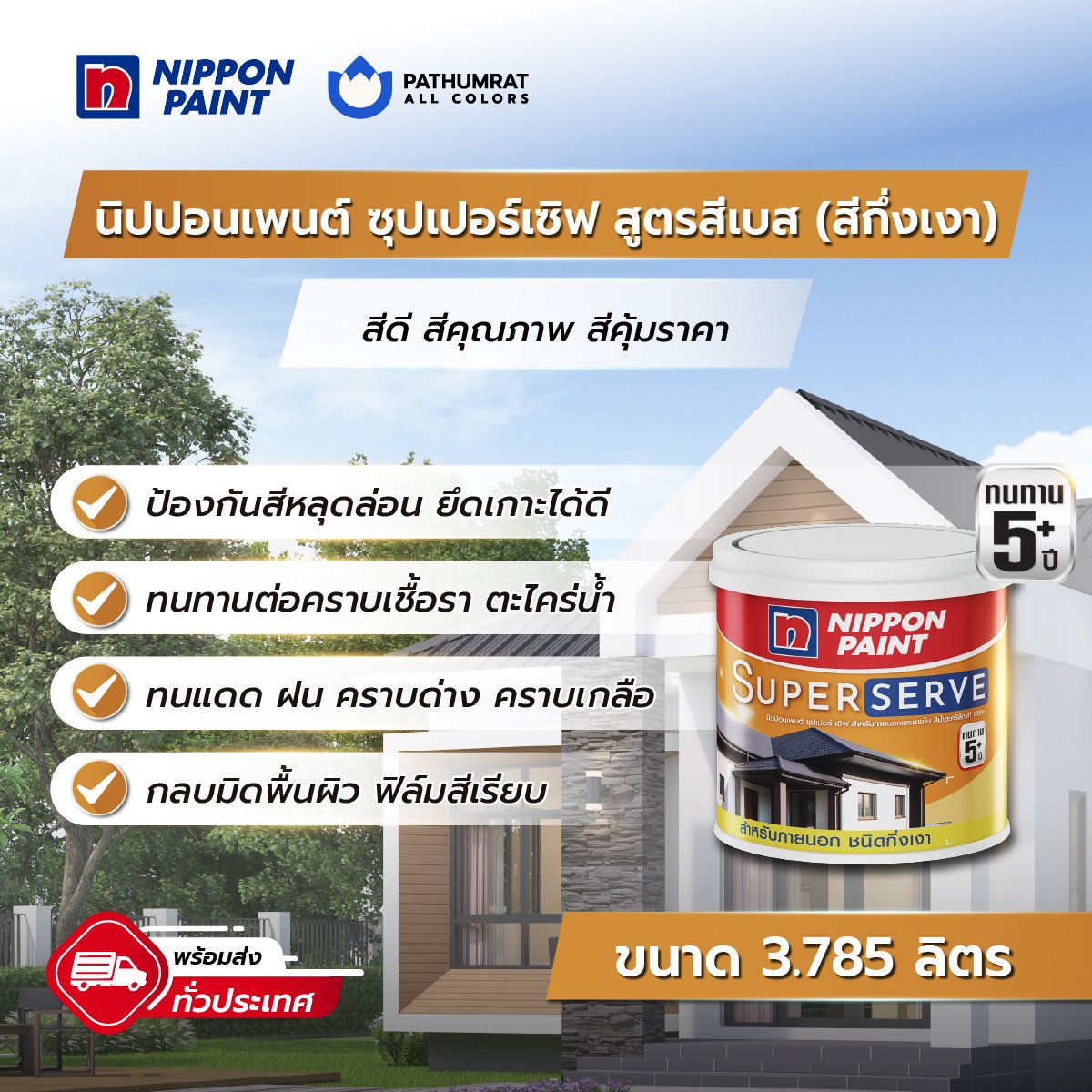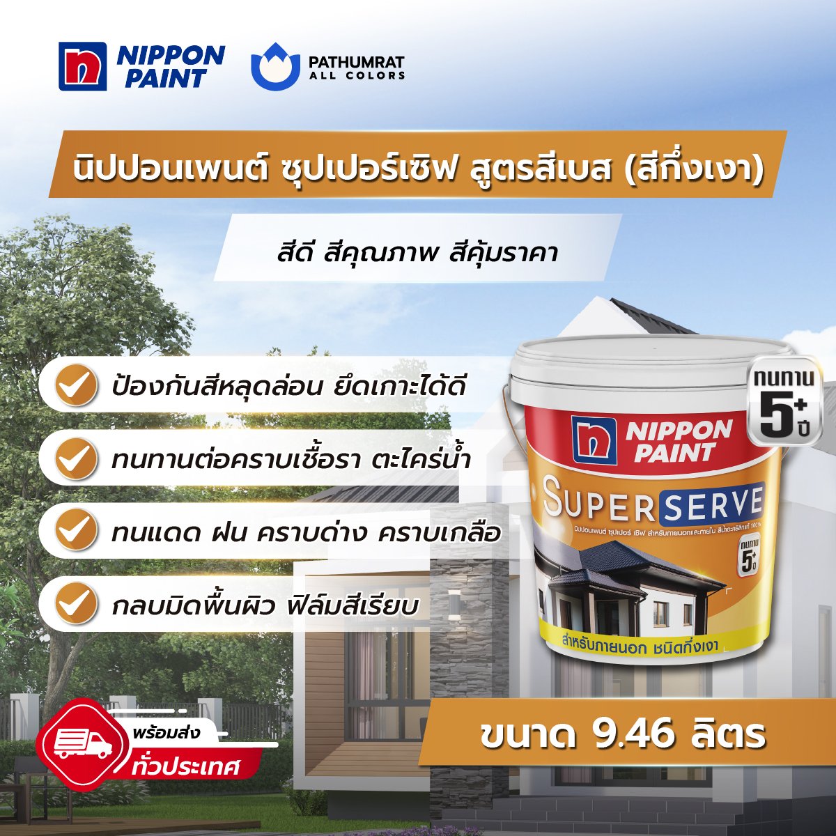 เป็นสีทาบ้านในราคาประหยัด สีทาภายนอกและสีทาภายใน สีผลิตจากกาวอะคริลิก100% เป็นสีที่เพิ่มประสิทธิภาพการยึดเกาะ ทนทาน คุณภาพสูง ภายใต้มาตรฐาน (มอก.)