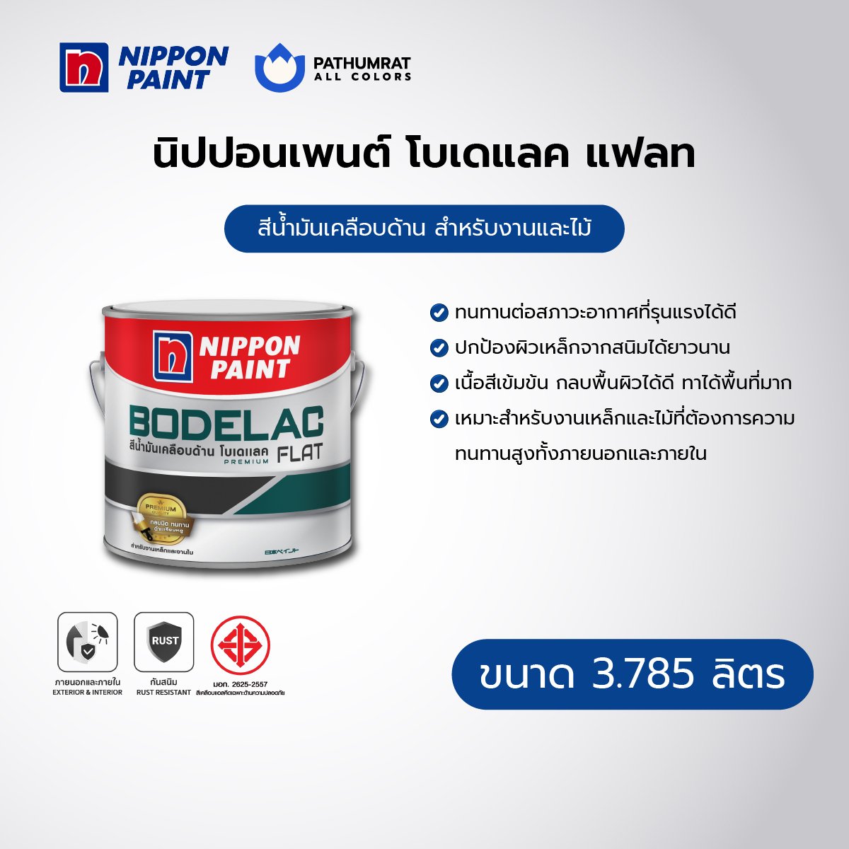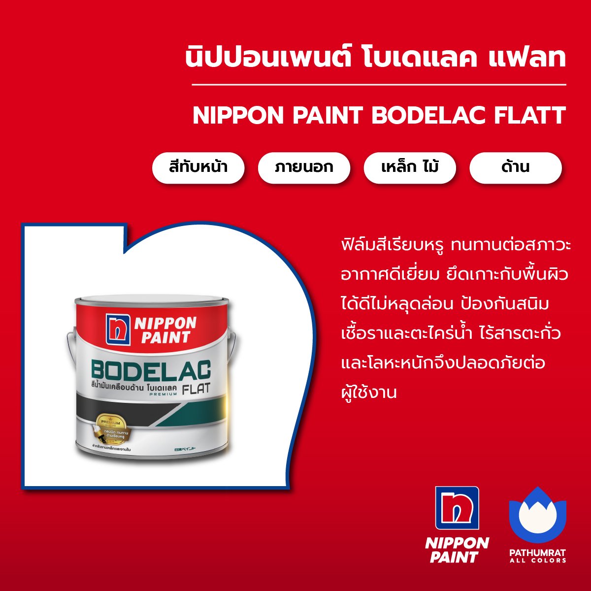 สีน้ำมันเคลือบด้าน สำหรับงานเหล็กและไม้ ฟิล์มสีเรียบหรู ทนทานต่อสภาวะอากาศดีเยี่ยม ป้องกันสนิม เชื้อราและตะไคร่น้ำ ไร้สารตะกั่วและโลหะหนัก