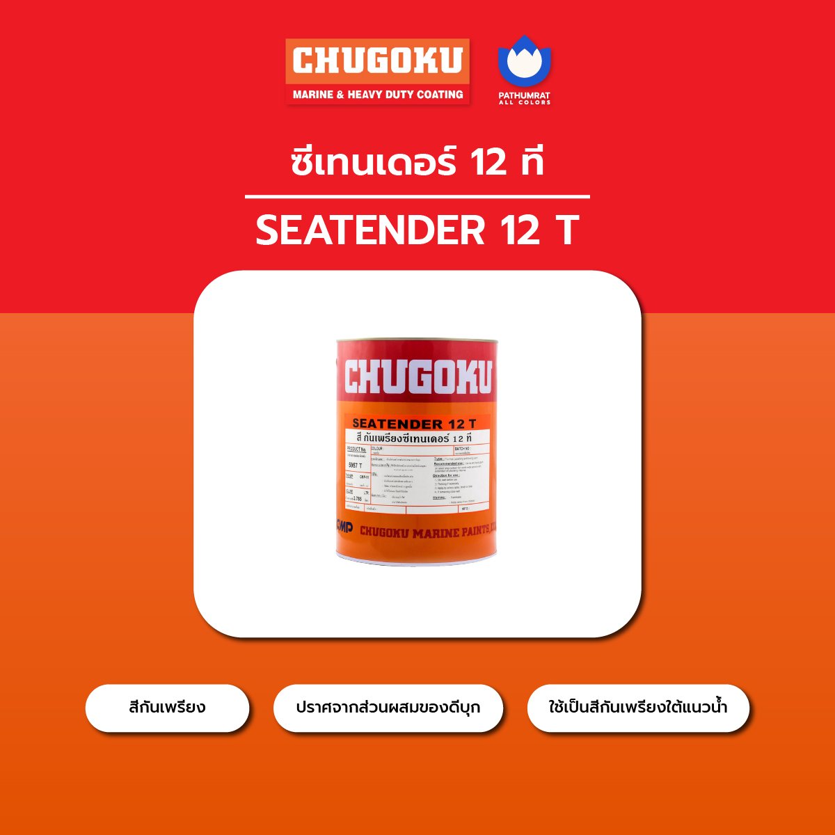 ซีเทนเดอร์ 12 ที เป็นสีกันเพรียงประเภทขัดผิวตัวเองที่ปราศจากส่วนผสมของดีบุก (Tin Free) ทําให้ไม่มีผลกระทบต่อ สิ่งแวดล้อมมีส่วนผสมของสารให้ความคงทนและสารป้องกันการเกาะจับของตัวเพรียงอยู่ในปริมาณมาก และด้วยระบบ กันเพรียง 2 ชั้นจึงป้องกันการเกาะจับของตัวเพรียงได้นานกว่า ดังนั้นจึงได้รับความนิยมจากเรือที่ใช้ในทะเลทั่วโลก ทั้งยังมีคุณสมบัติใช้งานง่ายสามารถทาทับสีกันเพรียงเก่าได้ทุกประเภท จึงเหมาะกับงานใหม่และงานซ่อมได้อย่างดี