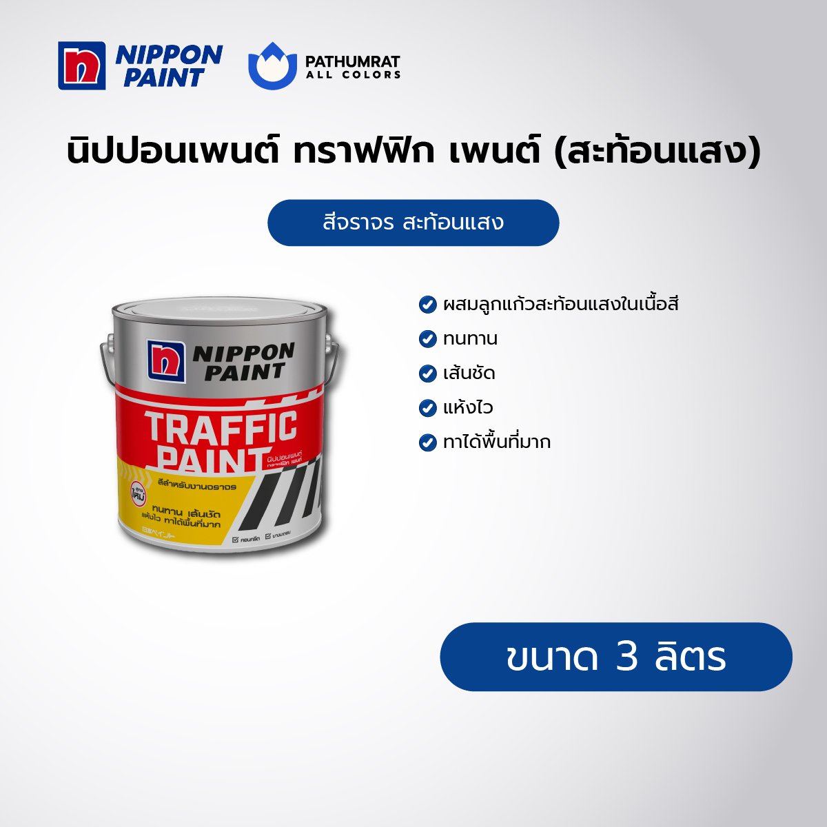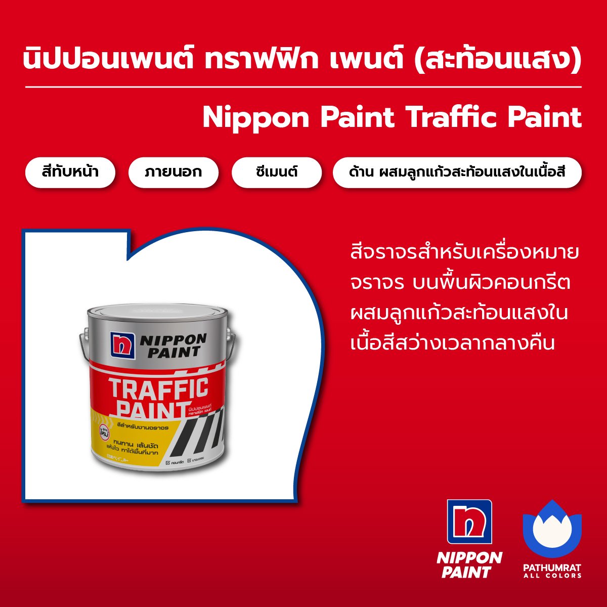สีจราจรสำหรับทำเครื่องหมายจราจร บนพื้นผิวคอนกรีต ยางมะตอย ชนิดสะท้อนแสง ผสมลูกแก้วสะท้อนแสงในเนื้อสี สว่างเวลากลางคืน เส้นชัด แห้งไว ทาได้พื้นที่มาก