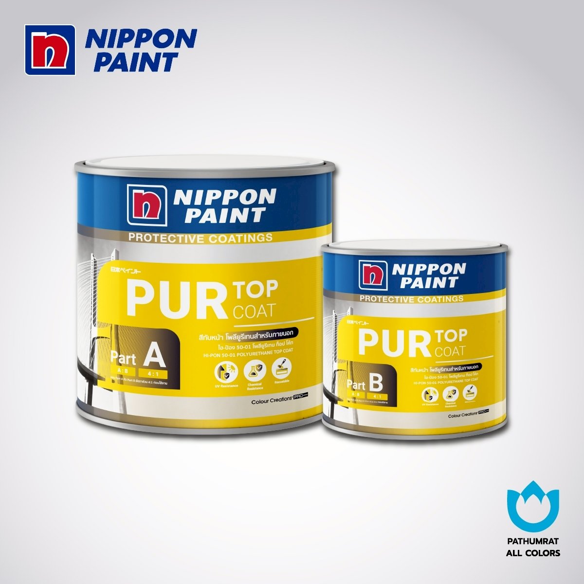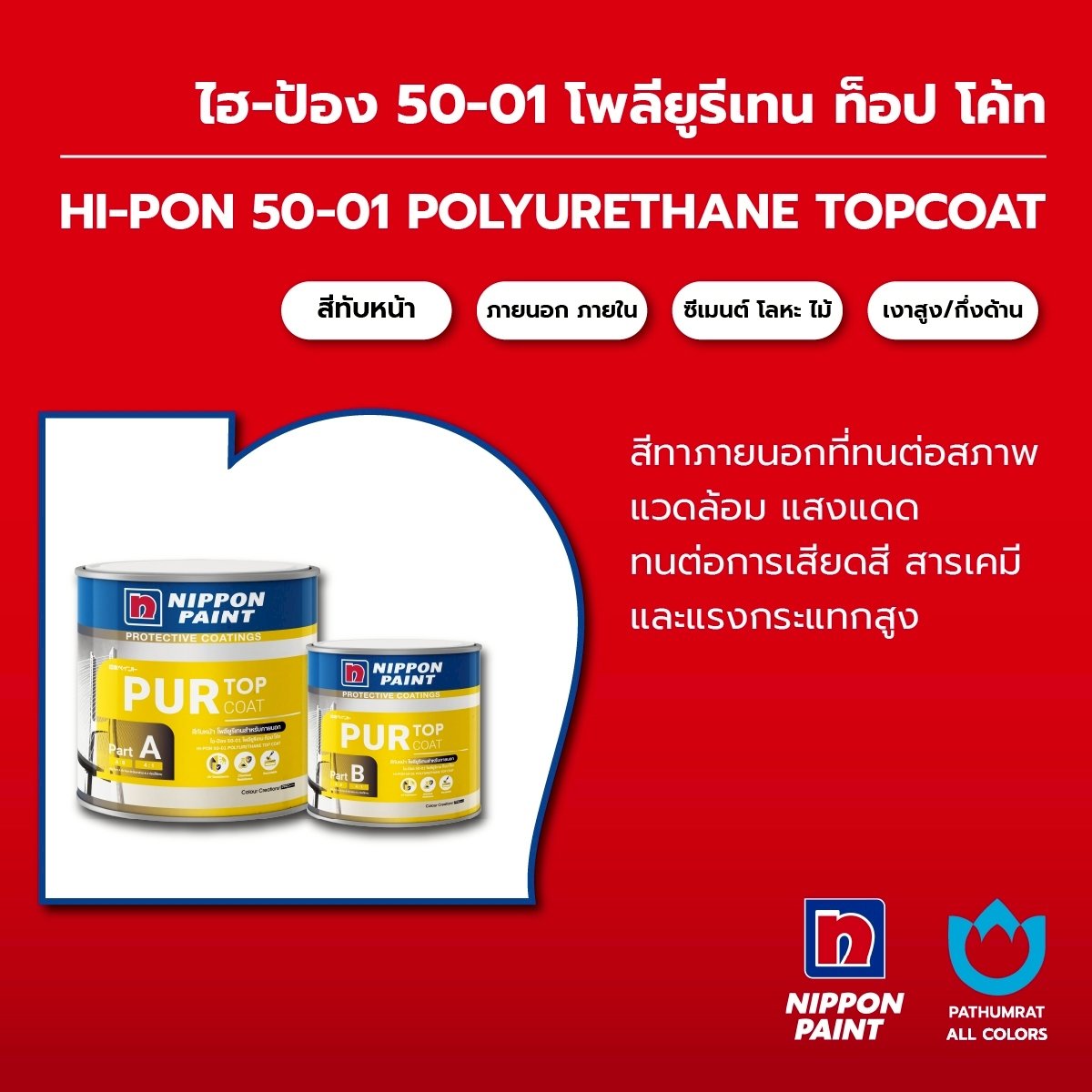 นิปปอนเพนต์ ไฮ-ป้อง 50-01 โพลียูรีเทน ท็อป โค้ท (NIPPON PAINT HI-PON 50-01 POLYURETHANE TOPCOAT) สีอุตสาหกรรม สีทับหน้าประเภทโพลียูรีเทน ชนิด 2 ส่วน สีทาภายนอกที่ทนต่อสภาพแวดล้อม แสงแดด คงความเงาและเฉดสีดีเยี่ยม ทนต่อการเสียดสี สารเคมี น้ำมัน และแรงกระแทกสูง เหมาะสำหรับงานก่อสร้างใหม่และงานซ่อมบำรุงในหลากหลายสภาวะ เช่น โครงสร้างแนวชายฝั่ง โรงกลั่น โรงไฟฟ้า สะพาน ขนส่งและอาคาร เป็นต้น