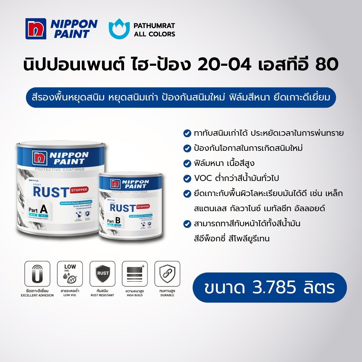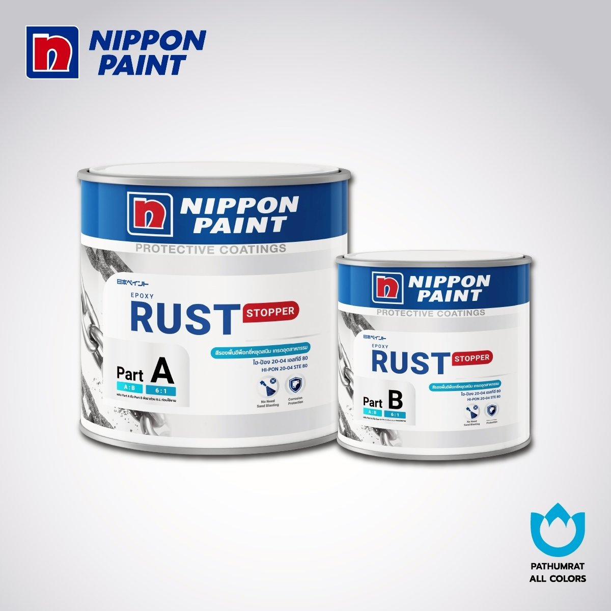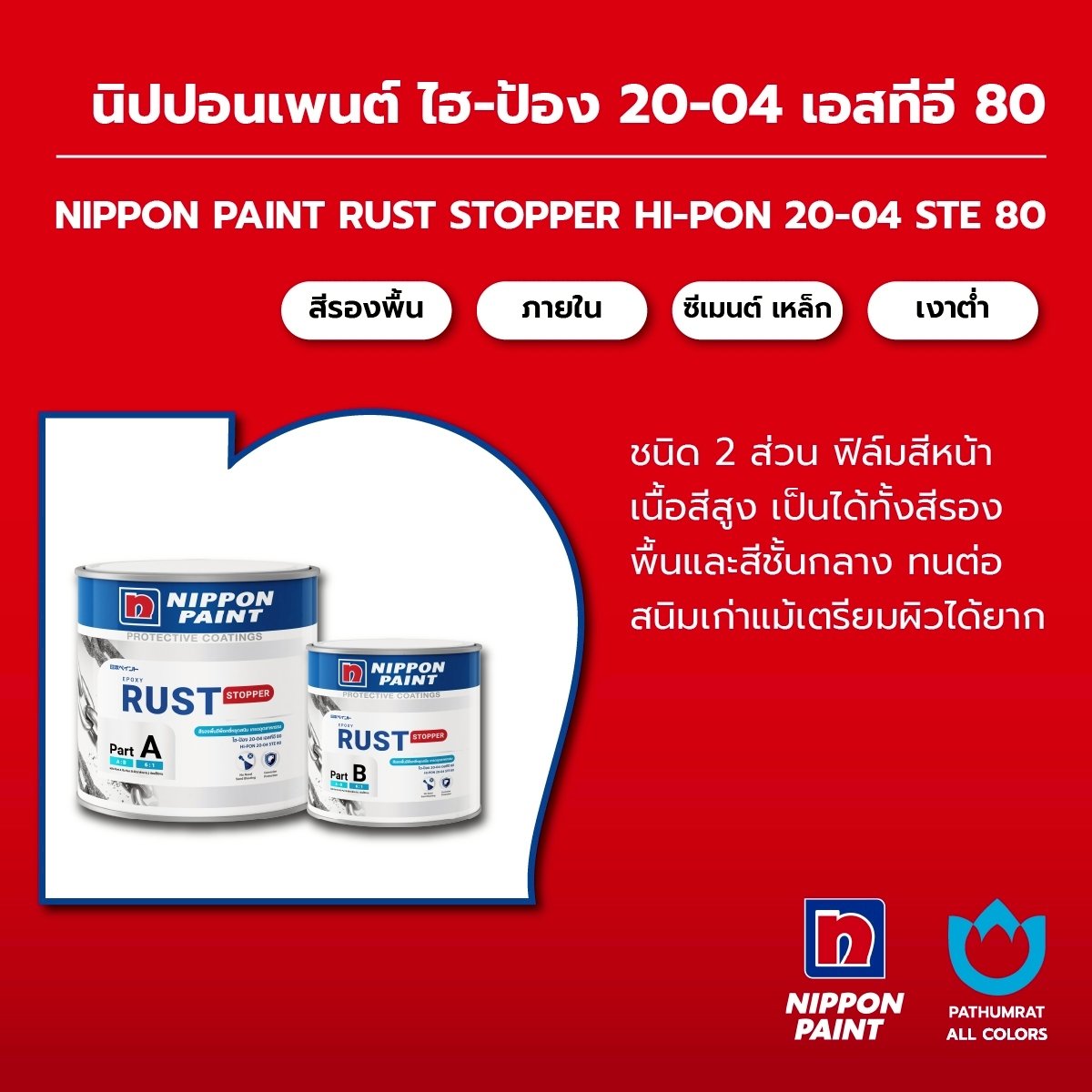 สีกันสนิม นิปปอนเพนต์ ไฮ-ป้อง 20-04 เอสทีอี 80 (NIPPON PAINT RUST STOPPER HI-PON 20-04 STE 80) เป็นสีอีพ็อกซี่หยุดสนิมเกรดอุตสาหกรรม ชนิด 2 ส่วน ฟิล์มสีหนา เนื้อสีสูง ที่เป็นได้ทั้งสีรองพื้นและสีชั้นกลาง มีประสิทธิภาพในการทนต่อสนิมเก่าแม้เตรียมพื้นผิวได้ยาก เช่น งานซ่อมบำรุง